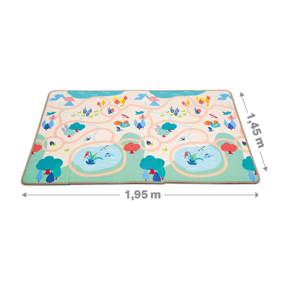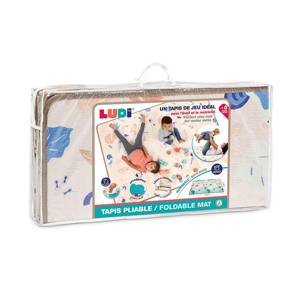 Αναδιπλούμενο δάπεδο ασφαλείας δύο όψεων από την εταιρεία Ludi. Ένα μεγάλο ενιαίο χαλί παιχνιδιού δραστηριοτήτων για να παίζει με ασφάλεια το παιδί καθώς απορροφάει τους κραδασμούς από ενδεχόμενες πτώσεις. Ανοίγει και κλείνει εύκολα για να αποθηκευτεί μέχρι την επόμενη φορά. Καθαρίζεται εύκολα με ένα πανάκι. Είναι ενιαίο και δεν χωρίζεται σε κομμάτια. Μέγεθος προιόντος: 195 x 145 εκ.