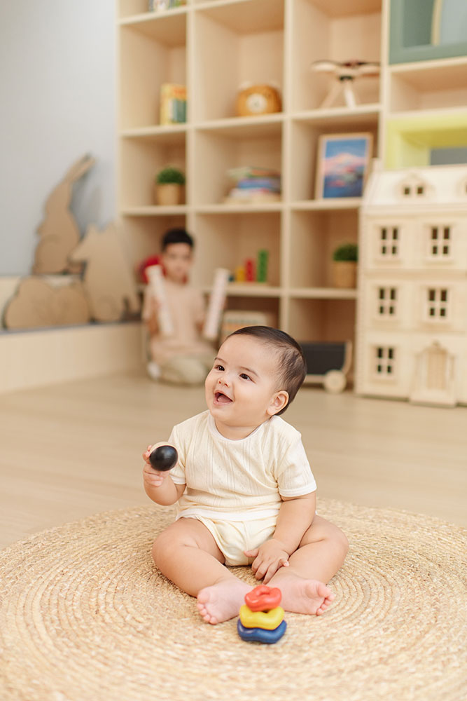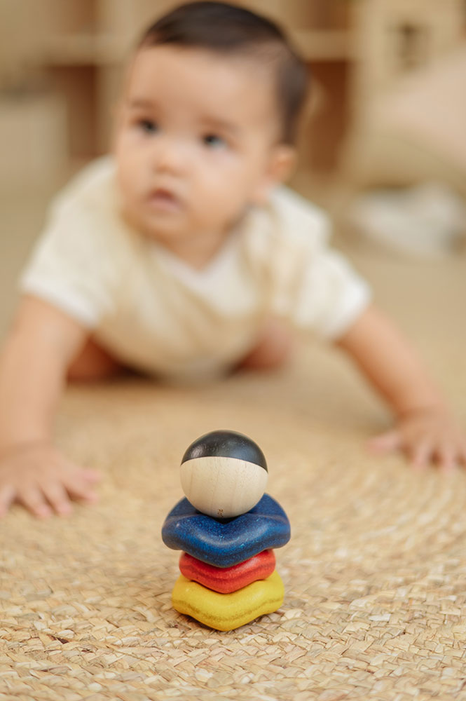 Αυτό το κυματοειδές παιχνίδι στοίβαξης προσκαλεί το παιδί σε μια ανοιχτή και δημιουργική εξερεύνηση με κομμάτια που μπορούν να συνδυαστούν ελεύθερα και είναι ευχάριστα στο κράτημα. Χωρίς κάποιο κεντρικό στύλο, τα παιδιά μπορούν να στοιβάζουν ελεύθερα, πειραματιζόμενα με την ισορροπία και την αλληλουχία. Η μπάλίτσα-καμπάνα ενισχύει την ακουστική ανάπτυξη, ενθαρρύνοντας την εστίαση στον ήχο. Τα κύματα αλληλοσυνδέονται με πολλαπλούς τρόπους – κάθετα και οριζόντια – ενθαρρύνοντας την επίλυση προβλημάτων, τη λογική σκέψη και τις λεπτές κινητικές δεξιότητες.
