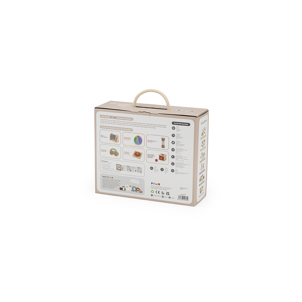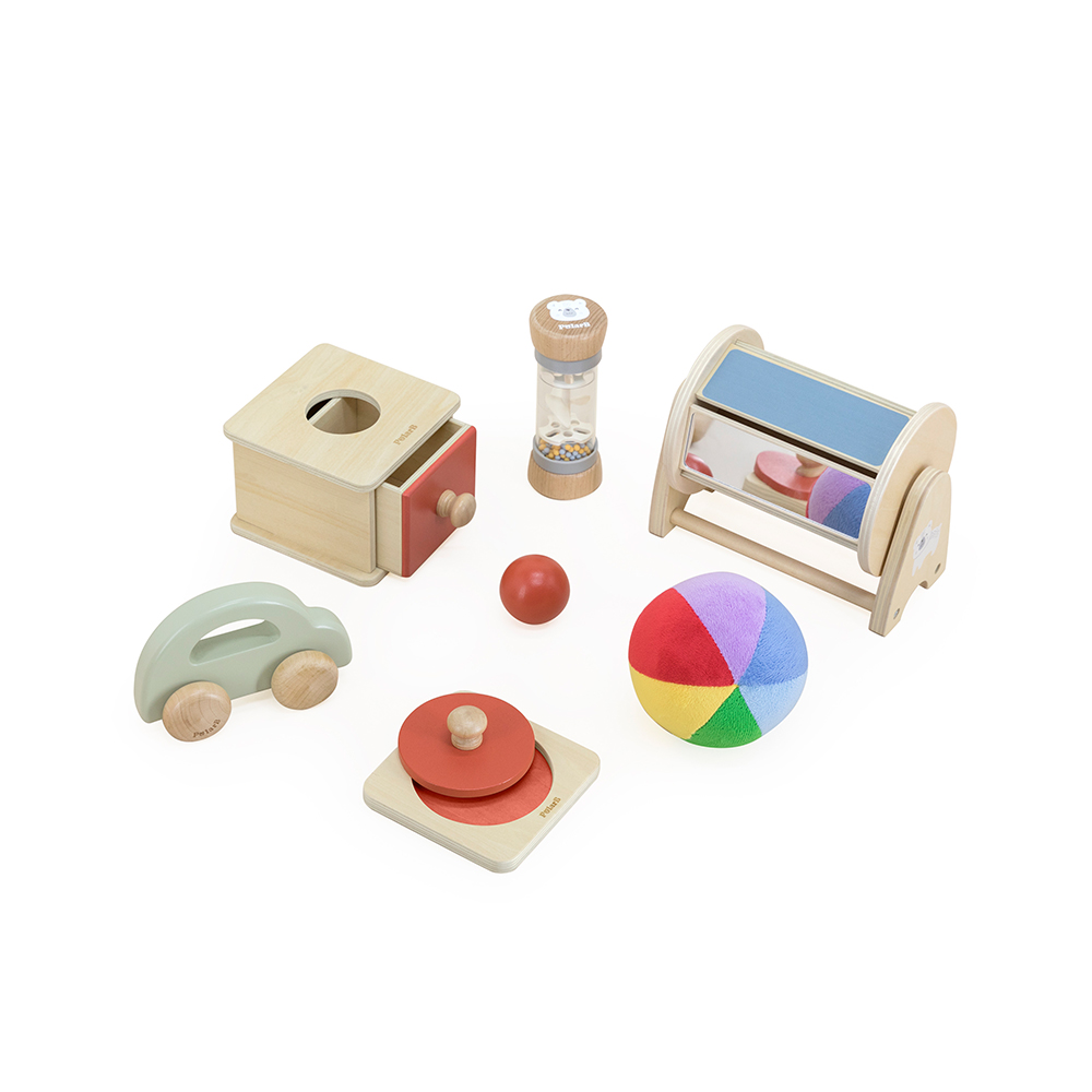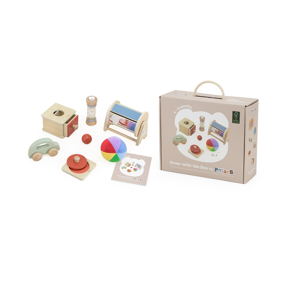 Καλώς ήρθατε στον κόσμο μικροί εξερευνητές! Το Grow with Me – Little Explorers από τη σειρά PolarB της Viga είναι το ιδανικό εκπαιδευτικό σετ για βρέφη 6-12 μηνών που λατρεύουν να παρατηρούν για να ανακαλύψουν τον κόσμο γύρω τους! Σχεδιασμένο για να ενισχύει την ανάπτυξη των αισθήσεων μέσα από το παιχνίδι, αυτό το σετ προσφέρει ασφαλή διασκέδαση με παιχνίδια φτιαγμένα από υψηλής ποιότητας ξύλο, φιλικά προς το περιβάλλον και κατάλληλα για μικρά χεράκια. Το κουτί περιέχει: 1. Μπάλα “Ουράνιο Τόξο” 2. Βροχοποϊό 3. Αυτοκινητάκι 4. Γεωμετρικό ενσφήνωμα 5. Συρταρωτό κουτί 6. Χρωματιστό κύλινδρο