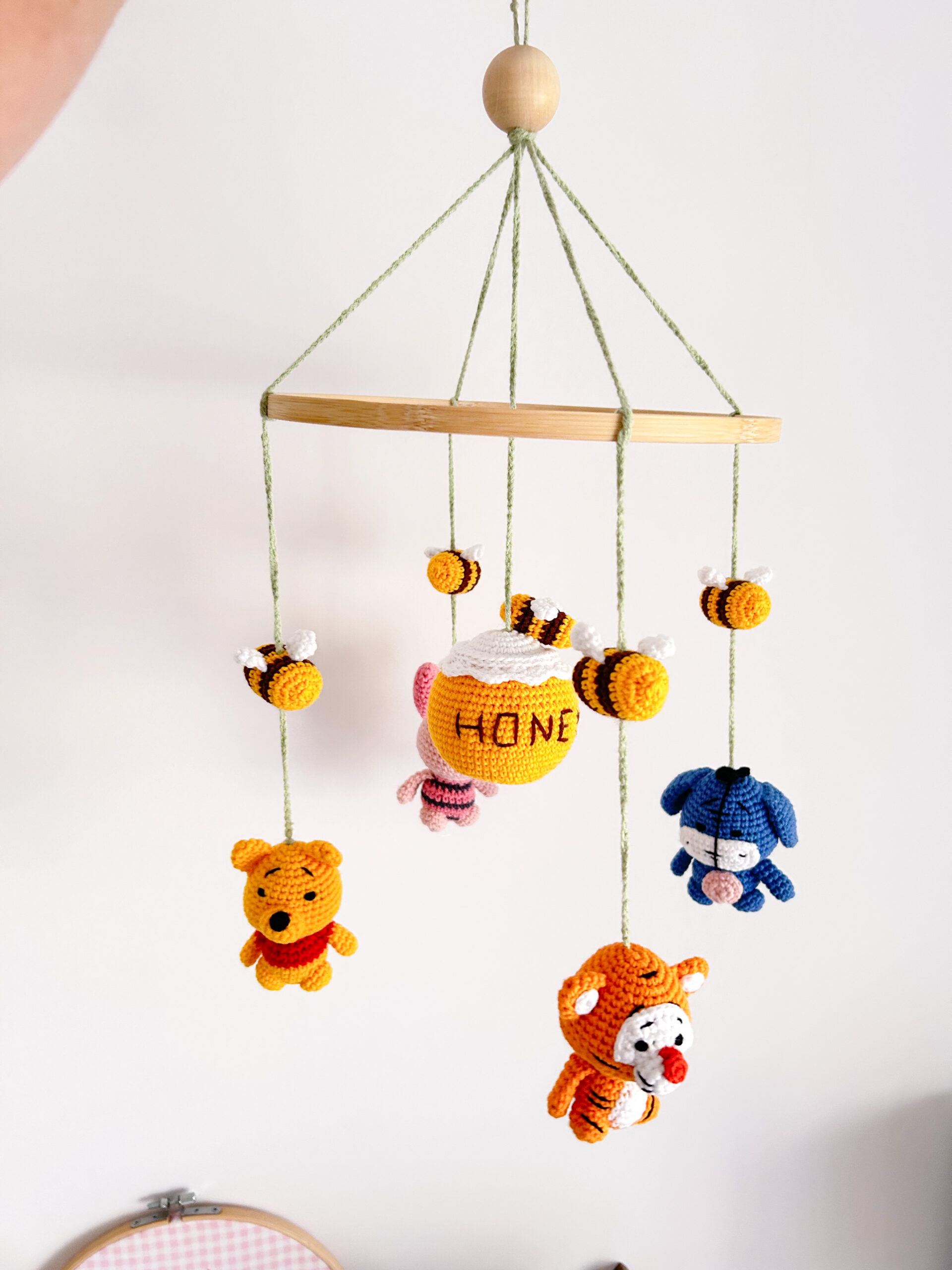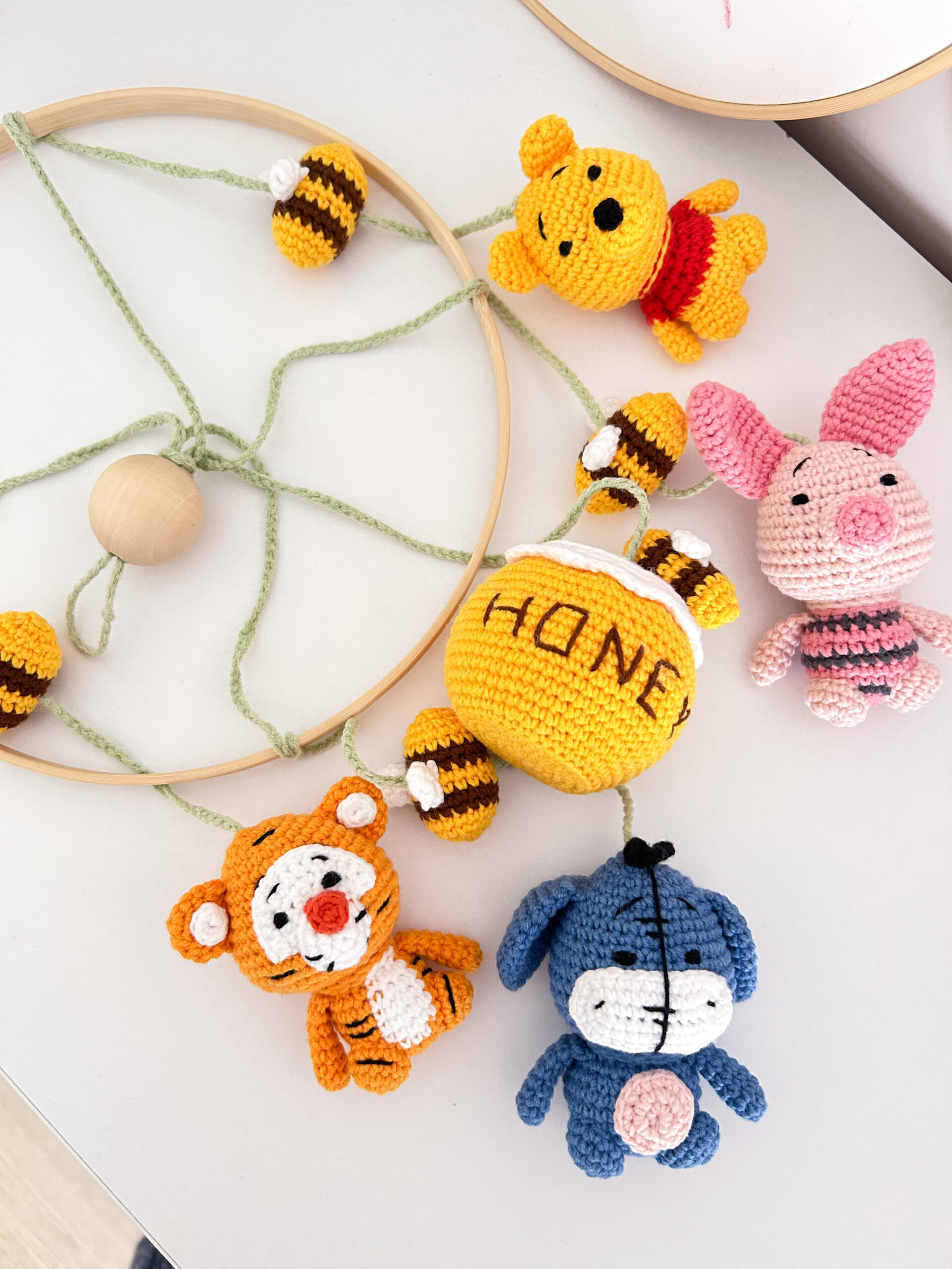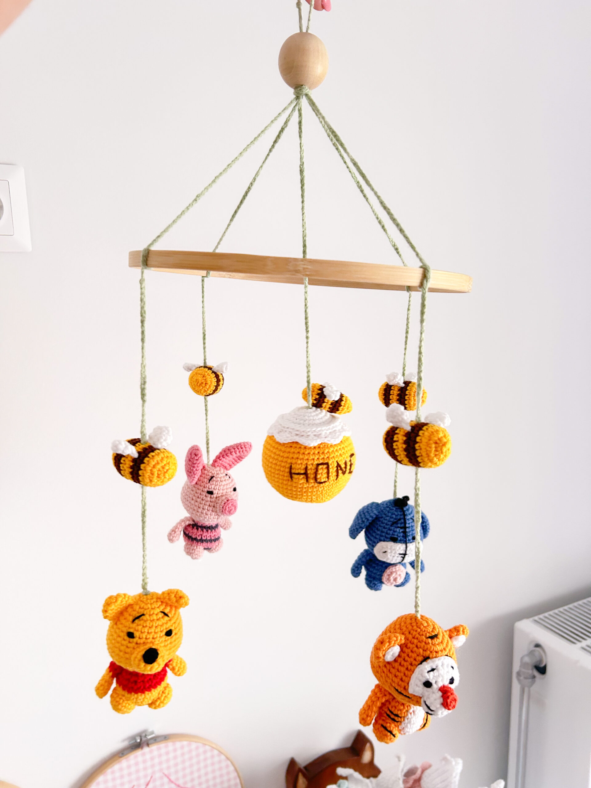 Χειροποίητο διακοσμητικό πλεκτό μόμπιλε με θέμα τον Γουίνι (Winnie The Pooh) για το βρεφικό δωμάτιο