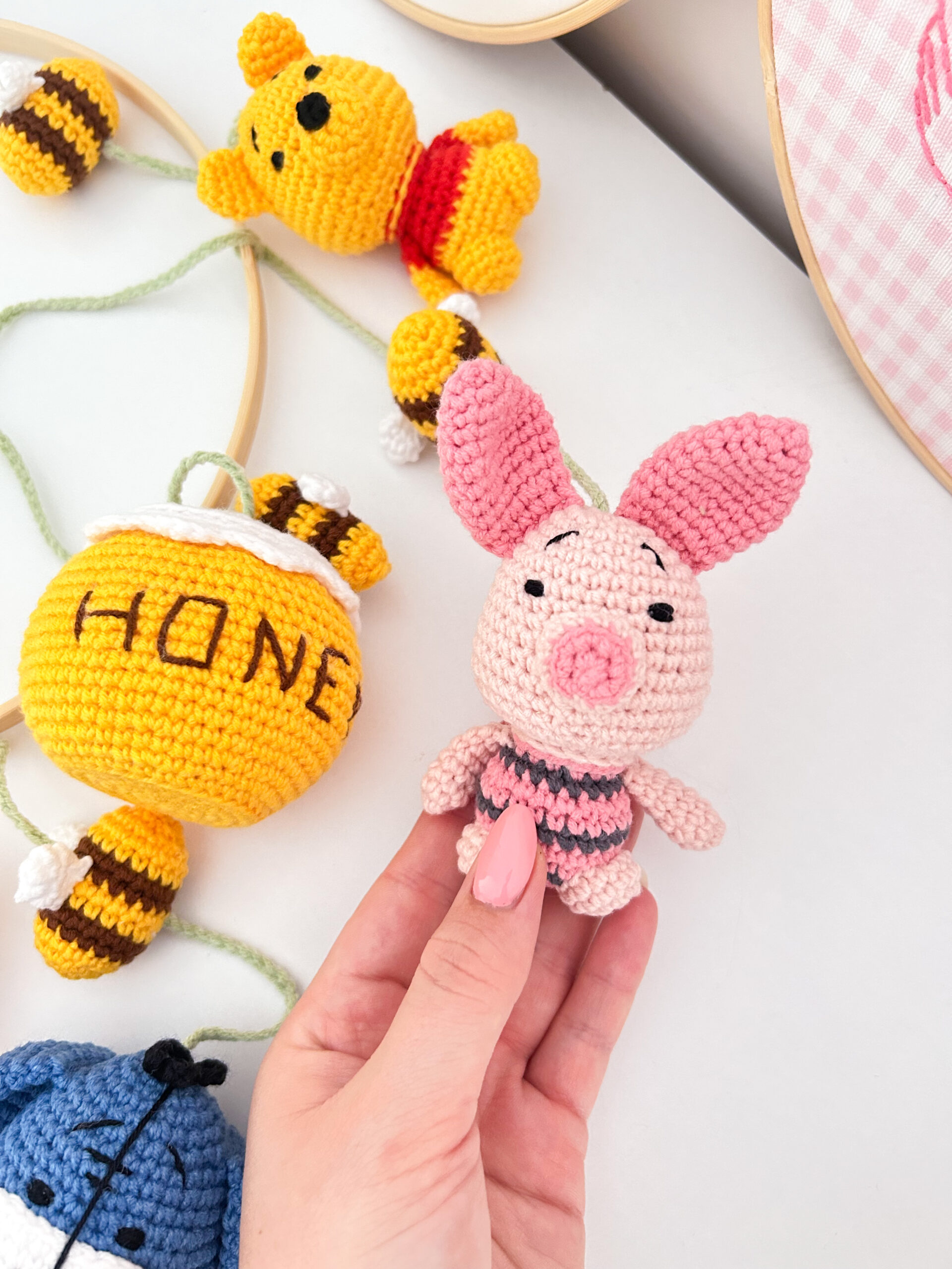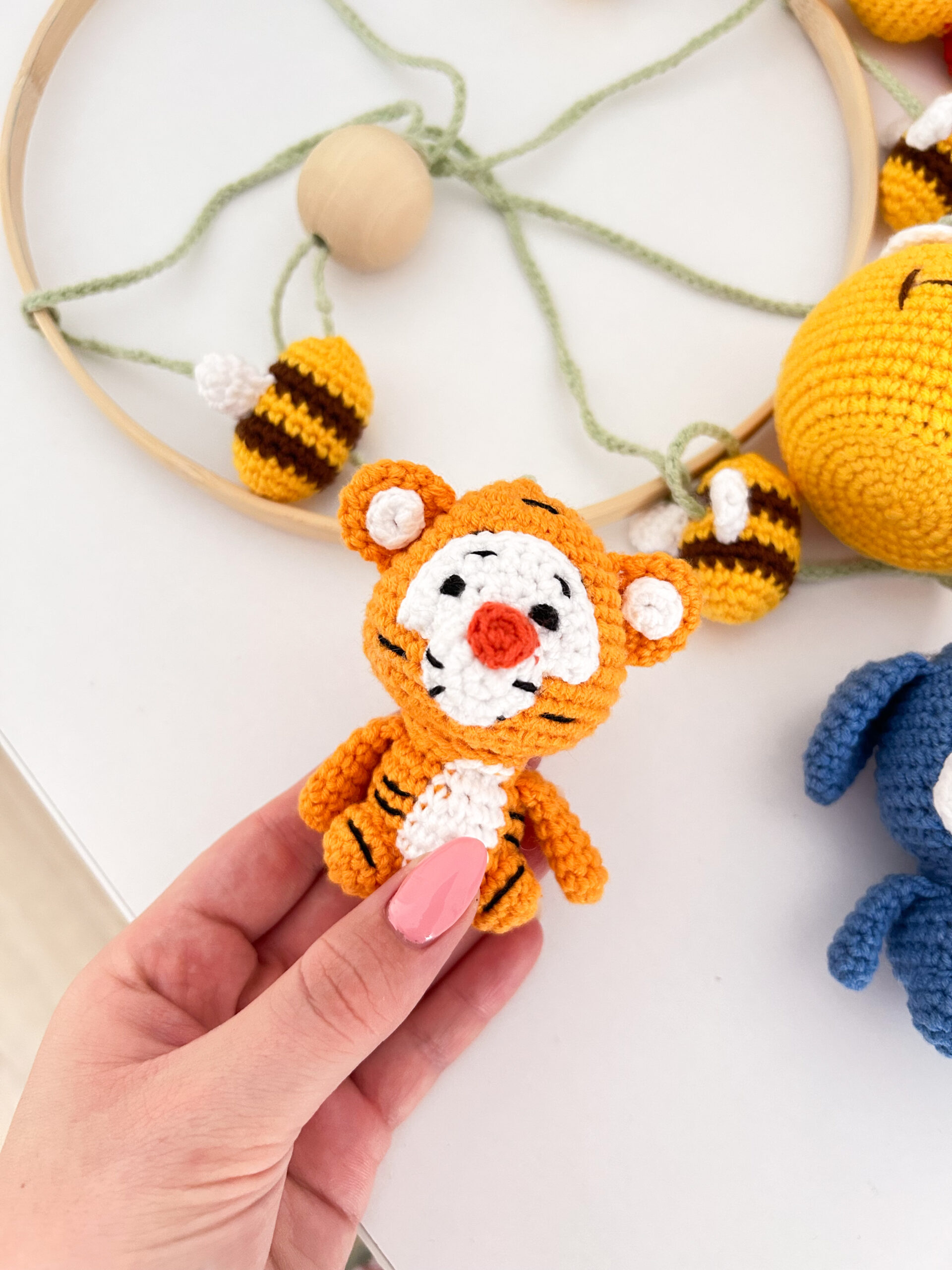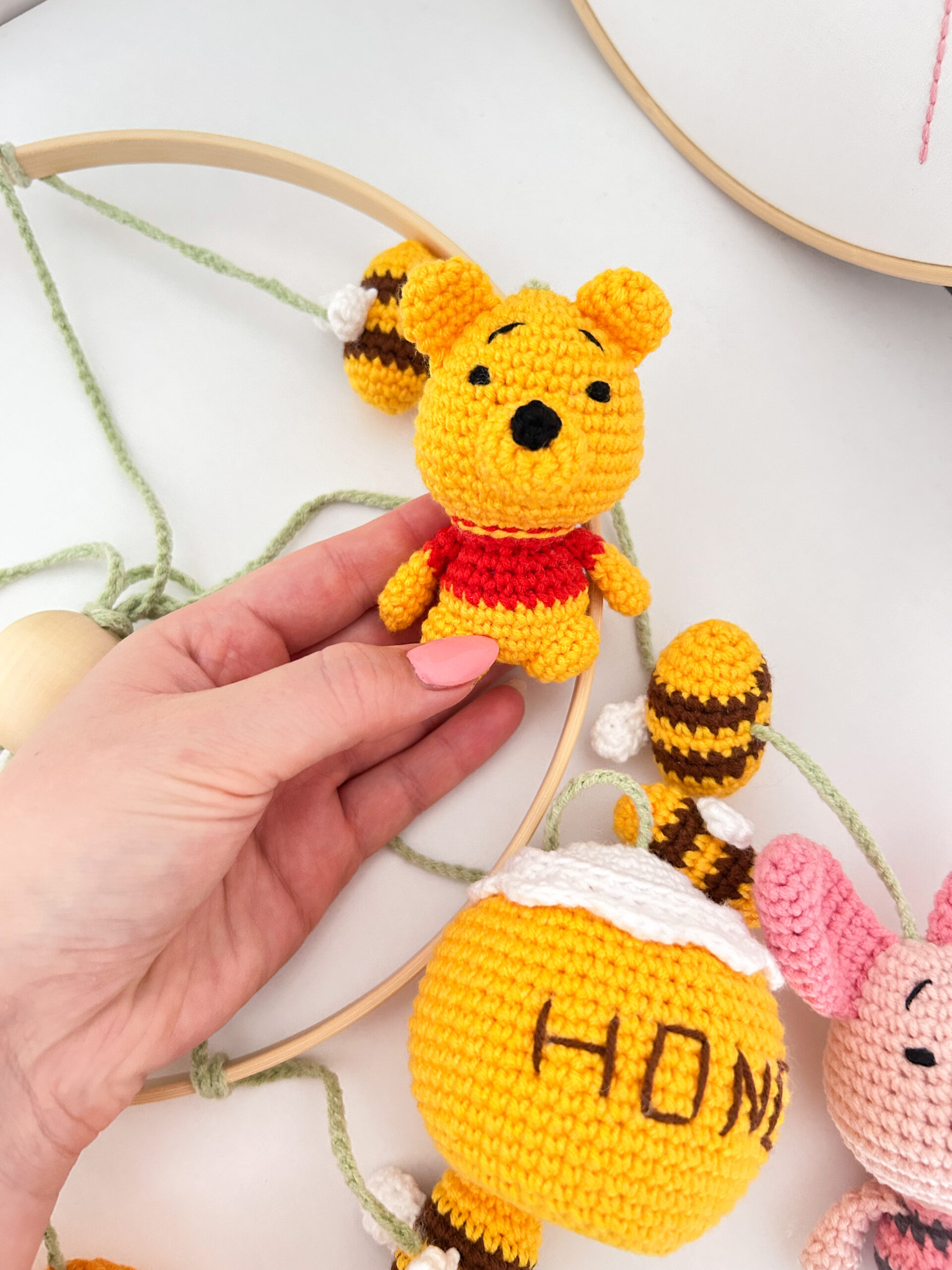 Χειροποίητο διακοσμητικό πλεκτό μόμπιλε με θέμα τον Γουίνι (Winnie The Pooh) για το βρεφικό δωμάτιο