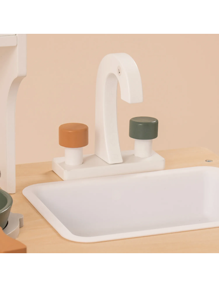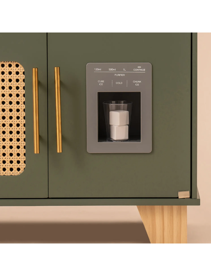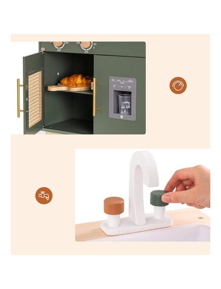 Με χρυσές λεπτομέρειες και ρατάν προσθήκη στο ντουλαπάκι για να την τοποθετήσετε σε οποιονδήποτε χώρο του σπιτιού σας! Είναι μια κανονική κουζίνα που τα έχει όλα και είναι στο μέγεθος του παιδιού για να έχει μία αληθινή εμπειρία μαγειρικής. Έχει δύο εστίες για μαγειρική, νεροχύτη, φούρνο, φουρνάκι μικροκυμάτων, ρολόι, ψυγείο που βγαίνουν παγάκια εξωτερικά και απαραίτητα αξεσουάρ!Περιλαμβάνονται: κατσαρόλα, τηγάνι και κουτάλες για τους μικρούς μας σεφ! Πάνω από τον νεροχύτη υπάρχουν γάντζοι για να κρεμάσετε τις κουτάλες!